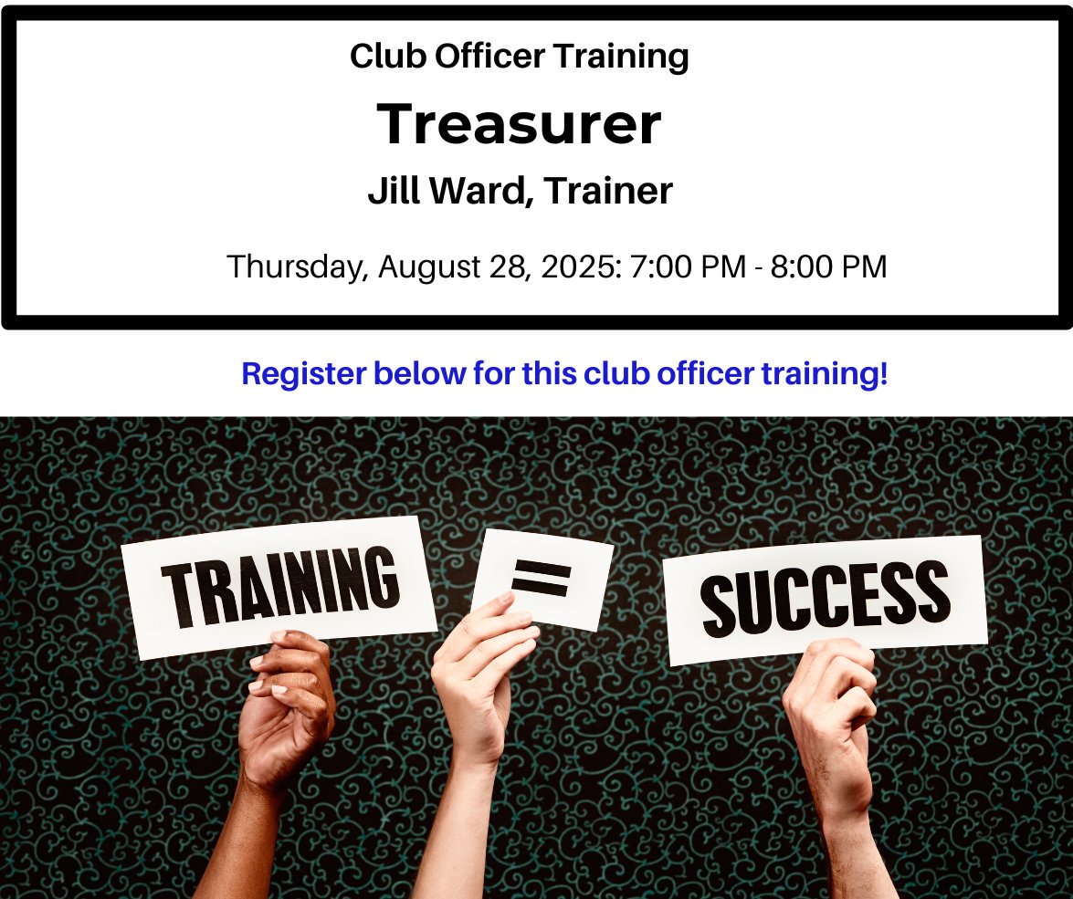 Location Online Date Aug 28 2025 Expired! Time Pacific Daylight Savings (PDT) 7:00 PM - 8:00 PM Online Club Officer Make-Up Training: Treasurer Training for Treasurer Thursday, August 28, 2025, at 7:00 PM Pacific Time Jill Ward is your trainer. Click here to register for the training event. Share this event + Add to Google Calendar + iCal / Outlook export