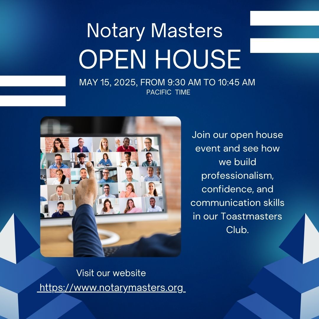 Organizer LaVern Bentz Location Online Date May 15 2025 Expired! Time Pacific Time 9:30 AM - 10:45 AM Notary Masters Open House Online: May 15, 2025 Notary Masters Open House Join our open house event on Zoom May 15, 2025 From 9:30 AM to 10:45 AM Pacific Time Click here to join the event! Share this event + Add to Google Calendar + iCal / Outlook export