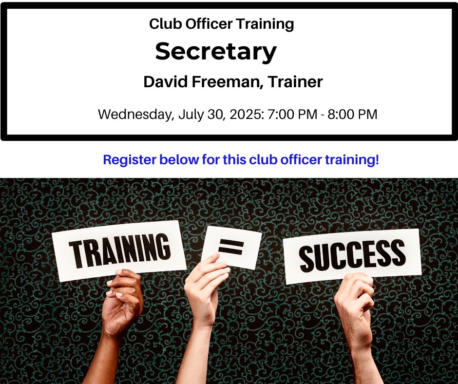 Organizer David Freedman Location Online Date Jul 30 2025 Expired! Time Pacific Daylight Savings (PDT) 7:00 PM - 8:00 PM Online Club Officer Make-Up Training: Secretary Club Secretary Training Wednesday, July 30, 2025, at 7:00 PM Pacific Time David Freedman is your trainer. Click here to register for the training event. Share this event + Add to Google Calendar + iCal / Outlook export