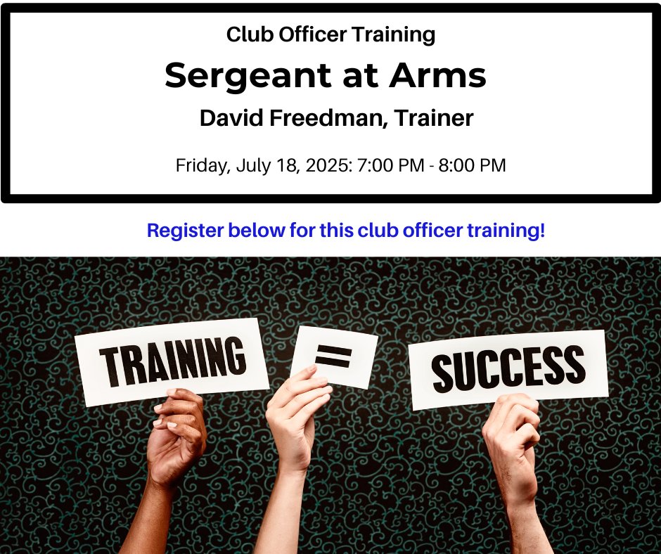 Organizer David Freedman Location Online Date Jul 18 2025 Expired! Time Pacific Daylight Savings (PDT) 7:00 PM - 8:00 PM Online Club Officer Make-Up Training: Sergeant at Arms Club Sergeant at Arms Training Friday, July 18, 2025, at 7:00 PM Pacific Time David Freedman is your trainer. Click here to register for the training event. Share this event + Add to Google Calendar + iCal / Outlook export
